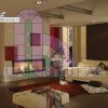 Caminetto ad accumulo rivestito con mattonelle in maiolica rettangolari e panca .