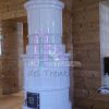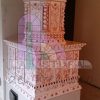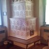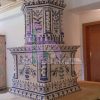 Stufa in maiolica misure 90×90 altezza cm 240 , interamente decorata a mano ( colore a scelta ) con colonne sui lati e torretta poligonale con prestigioso fregio superiore . Versione in foto con panca attorno in legno. Versione a quattro lati oppure appogiata su un lato al muro.