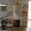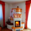 Stufa in maiolica con parti in muratura con rilievo sole e fuoco a vista. Colori a scelta. Misure 140x80x185