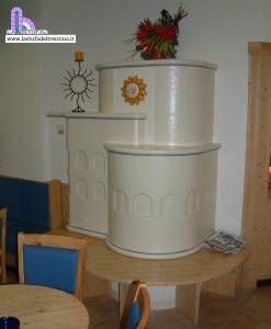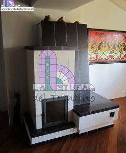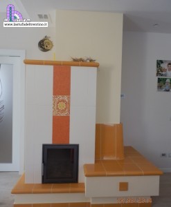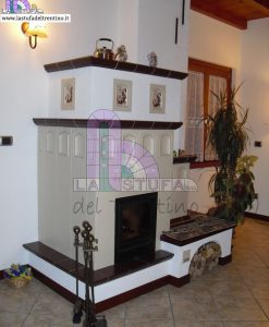 Stufa in maiolica con decorazione modulare a basso rilievo. Colori a scelta.
