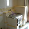 Cucina economica su misura rivestita in maiolica decorata abbinata con stufa ad olle.