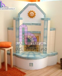 Stufa in maiolica ad accumulo a più livelli con mattonelle effetto bugnato e quattro quadretti decoro .
