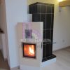 Stufa in maiolica, doppio volume con decori quadretto, panca e battiscopa in ceramica, cassettone porta legna e fuoco a vista.