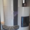 Stufa in maiolica con mattonelle grosso formato, fuoco a vista, mattonelle centrali rigate e panca con schienale in maiolica.