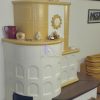 Stufa in maiolica con parti in muratura , nicchia porta oggetti e panca il legno.